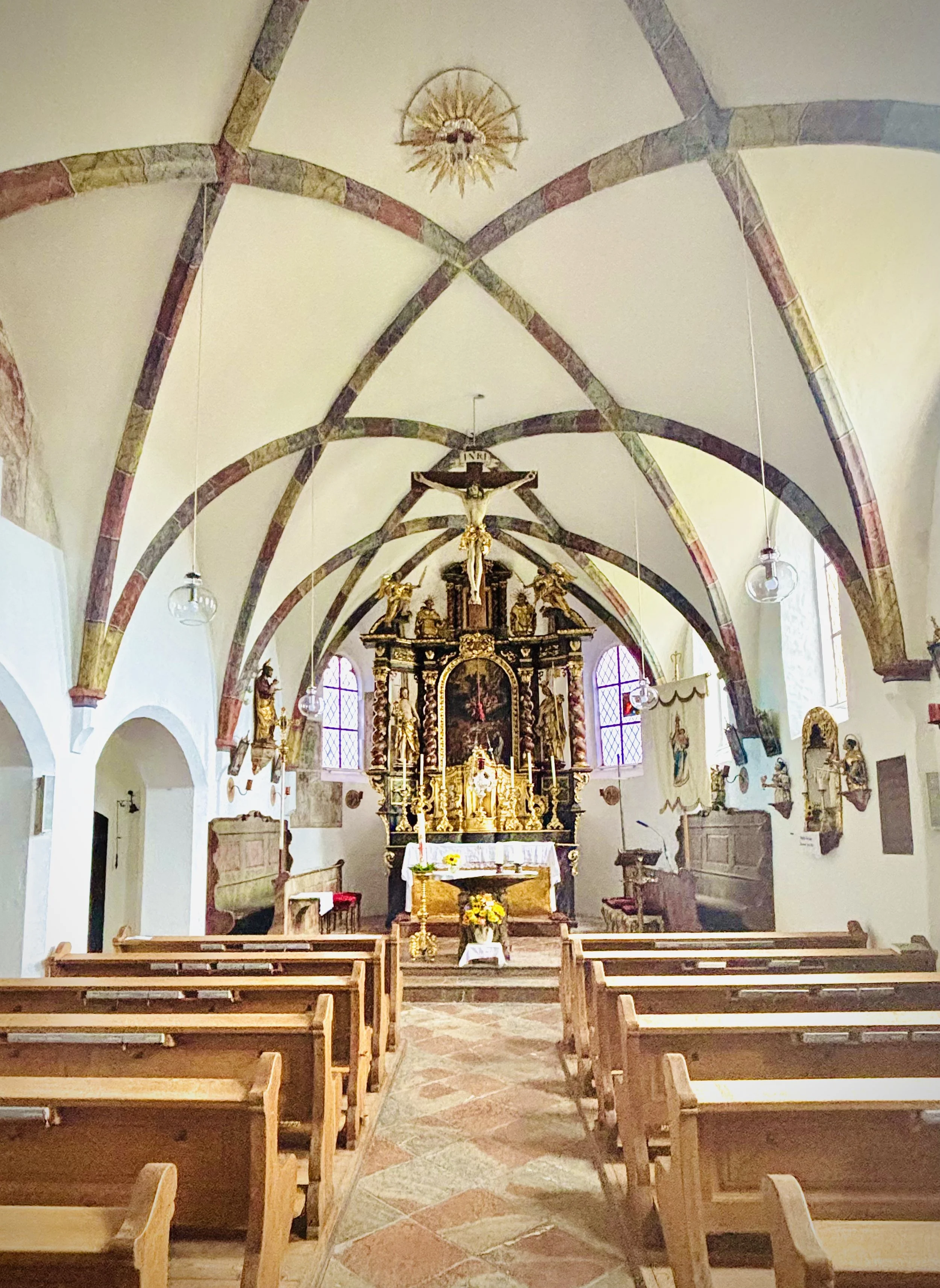 erbaut wurde die Pfarrkirche im 15. Jahrhundert, Langhaus z.T. u. UG des Turmes im 12. Jahrhundert, Kuppel 1772, Seitenschiff 1982, Ausstattung Barock, Fresken um 1430.